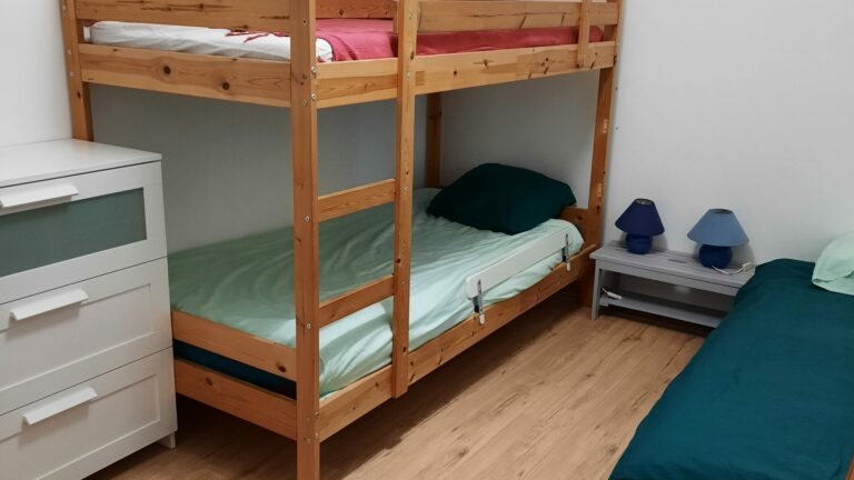 Une chambre avec un lit double et une autre avec 3 lits simples.